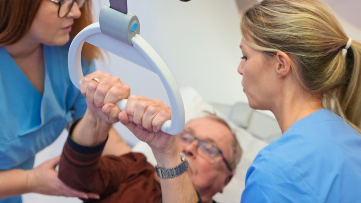 Die gezeigte Lösung setzt dort an, wo im Klinikalltag regelmäßig körperliche Belastung entsteht: beim Wechsel vom Bett oder Rollstuhl auf den CT-Tisch. Das Haltesystem lässt sich über das Bett schwenken, sodass Patientinnen und Patienten einen festen Griff vorfinden, an dem sie sich orientieren und aktiv mitarbeiten können.