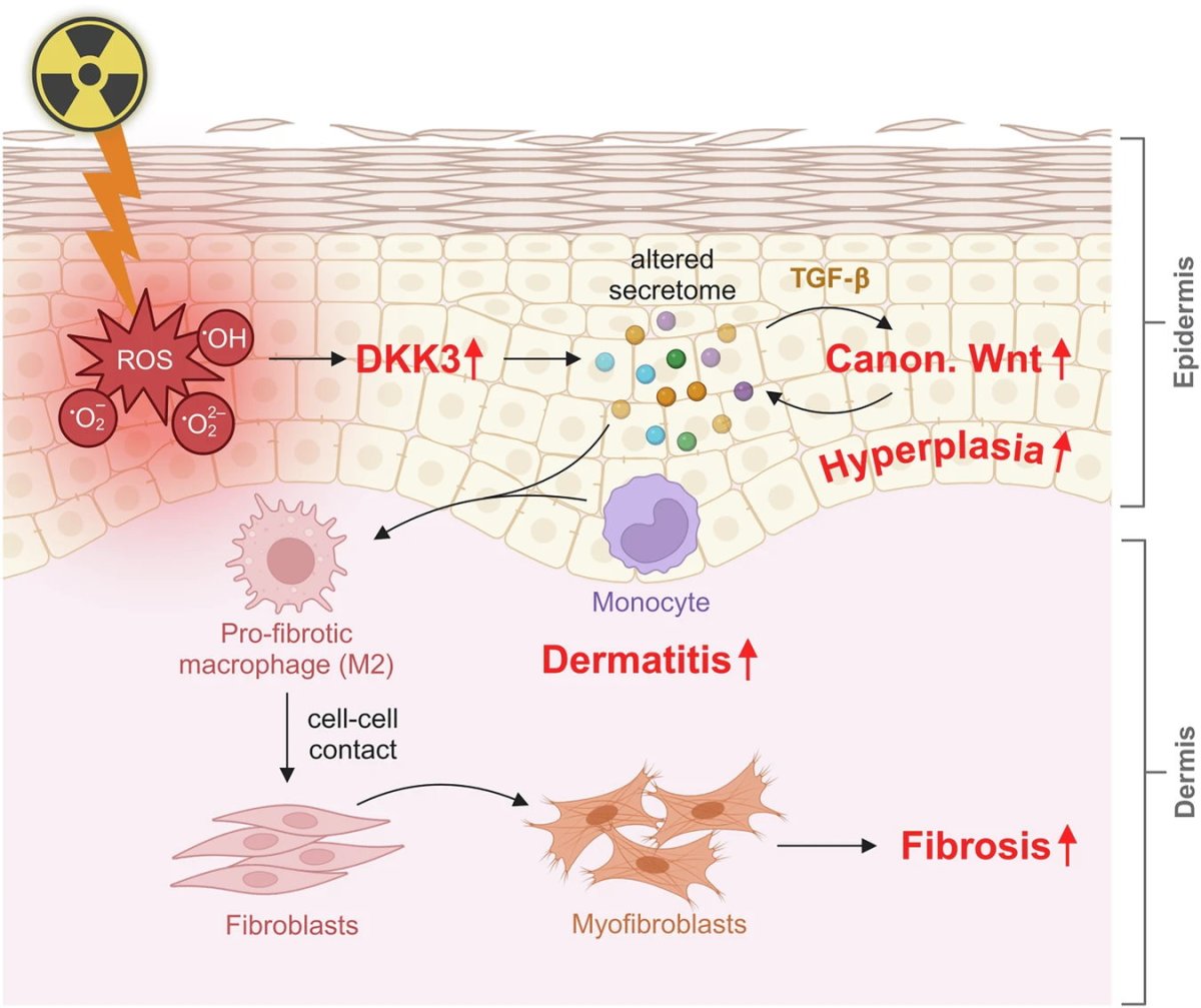 Strahlenbedingte Hautreaktionen beruhen auf komplexen biologischen Prozessen, an denen Zellen der Epidermis, des Bindegewebes und Immunzellen beteiligt sind. Die neue Studie zeigt an menschlicher Haut* und an Mäusen, dass Strahlung die Expression von Dickkopf-3 in Keratinozyten, den hornbildenden Zellen der Oberhaut, erhöht. Das führt zu zellulären Signalen, die die Überproduktion reaktiver Sauerstoffspezies begünstigen, das Zellwachstum beschleunigen und die Bindegewebszellen aktivieren, die für die Bildung von Narbengewebe und Fibrose verantwortlich sind.