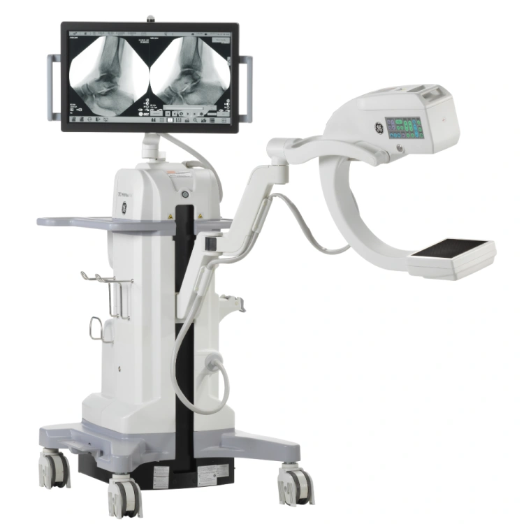 The OEC MiniView MAX can be controlled quickly and easily with just one hand. The innovative mini-C-arm with a wireless footswitch enables simple positioning during any procedure. Two full-featured monitors display live and reference images in identical quality and resolution. Image quality and dose are optimized using modern CMOS detector technology. The C-arm offers reliability and increased productivity.