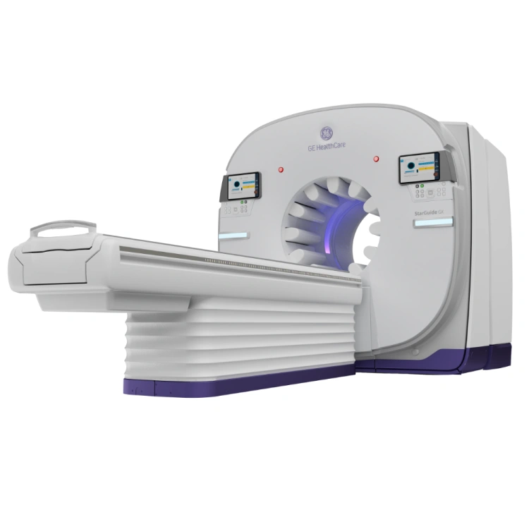 StarGuide GX is a digital 4D SPECT/CT system equipped with dual-side CZT (dsCZT). It integrates a collimator exchange mechanism capable of completing the process in less than 3 seconds, enabling rapid protocol transitions. This design supports full-spectrum nuclear imaging, including alpha-emitting isotopes. StarGuide GX delivers fast scans and supports confident diagnostics in both static and dynamic imaging. Designed with a 12-detector ring configuration, it offers all-purpose nuclear imaging capabilities and includes a slim gantry, cantilevered patient table, and an acquisition station combined with the high-performance CT system. The CT features a 40 mm CT detector with 64 physical detector rows and optional 128-slices overlapped reconstruction with 0.35 rotation speed and, with short-geometry, Performix™ 40 Plus X-Ray Tube, 7.0 MHU Tube anode heat storage capacity, maximum power of 72 kW or 55 kW and the detector with Clarity DAS and other advanced OptiDose™ dose management.