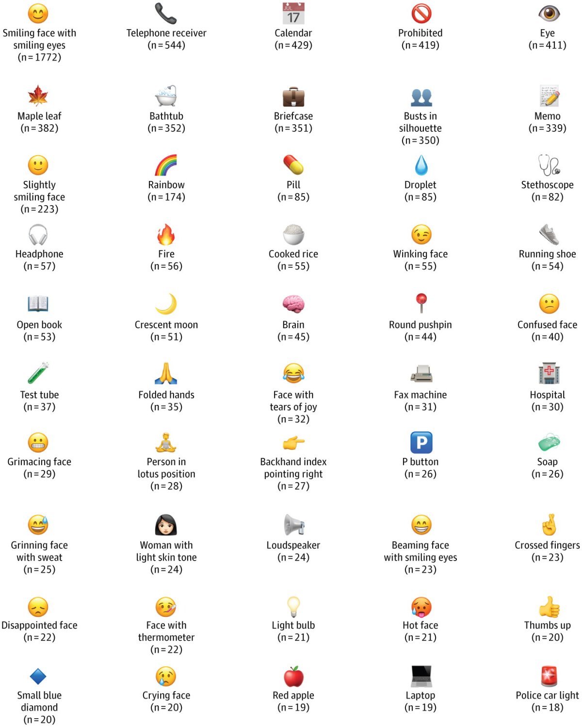 The most common kind of emojis used were smileys/emoticons (58.5%), followed by objects (21.2%) and people and body (17.6%). The most used emoji was the smiling face with smiling eyes (1,772 instances), followed by the telephone receiver (544) and the calendar (429). The hospital building emoji ranked 30th with just 30 instances.