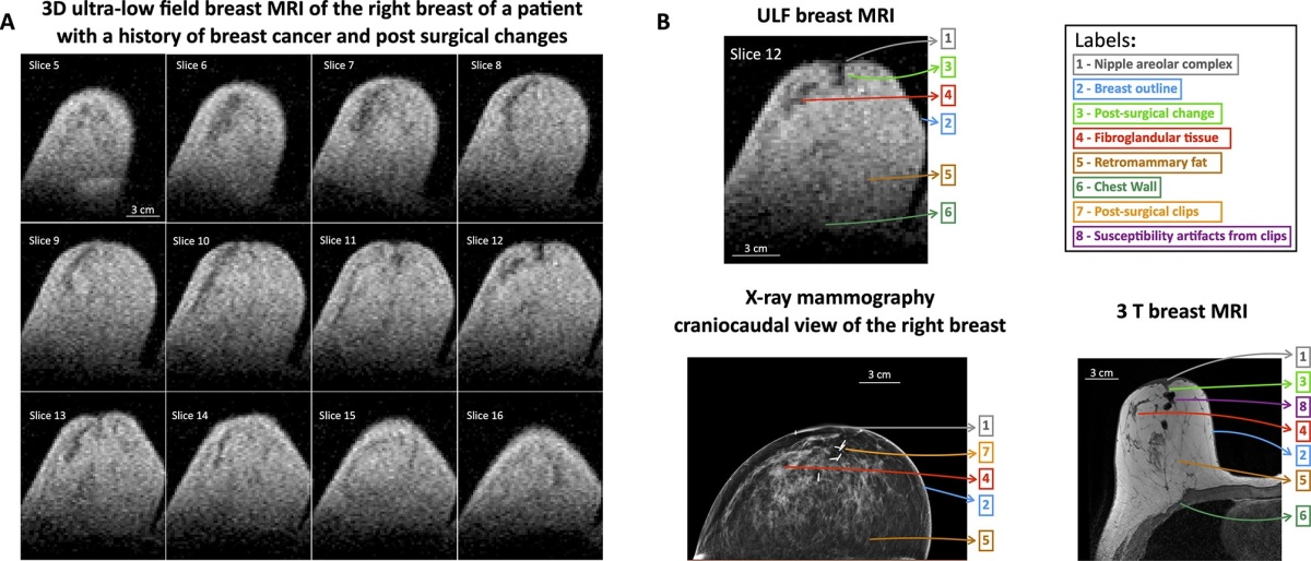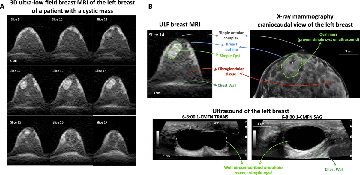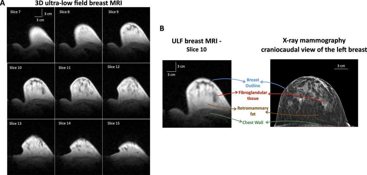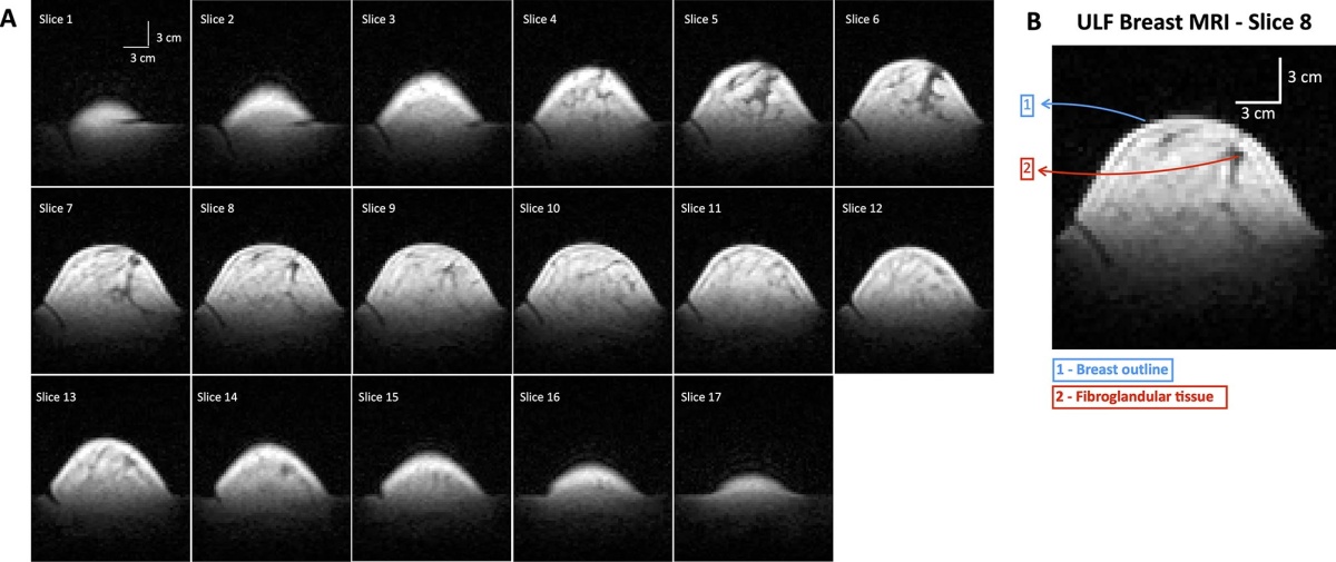 This early evidence suggests that ULF MRI can detect essential breast features and some abnormalities without radiation or injected contrast